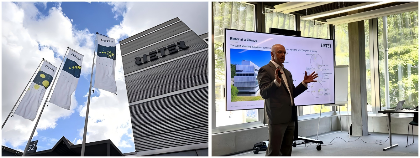 立达集团管理层售后事业部执行副总裁Alexander Özbahadir向研学团一行介绍了集团的成立历史、业务体系以及企业文化和战略愿景等。他提到,立达业务涵盖了从纤维到纱线的完整流程,正在从传统纺纱产业向人造纤维领域发展。稳定发展是立达公司发展的目标之一,因此以中国市场为核心的战略发展目标在未来不会改变。他还分享了立达在技术创新、生产管理、售后处理系统、可持续发展等方面的实践成果。随后,企业家们围绕市场趋势、行业挑战和应对策略等,与瑞士立达高管进行了深入交流,并集体参观了立达集团总部研发中心。