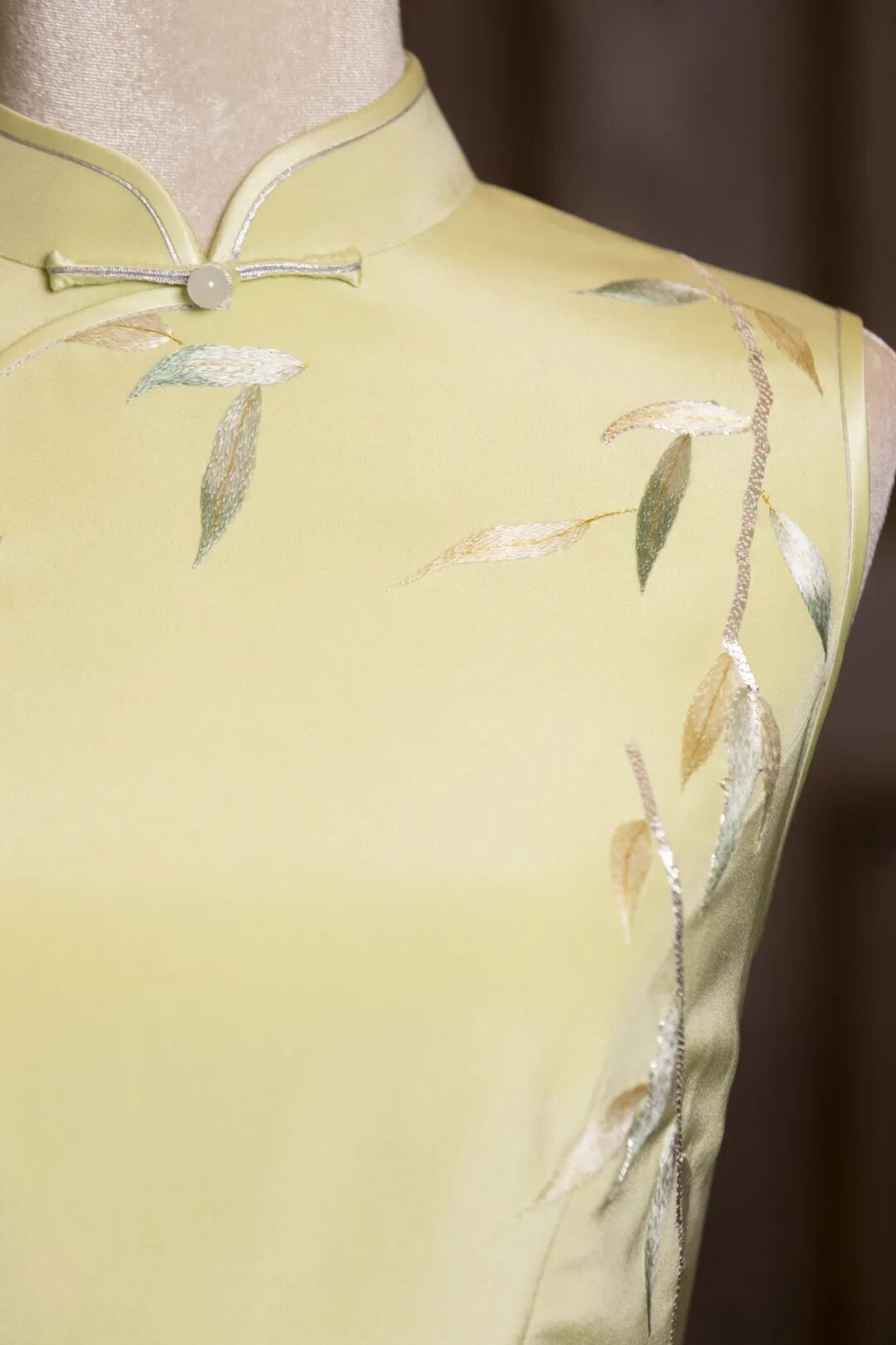 这一时期,旗袍款式的变化得到了长足发展。勤劳聪明的绣娘,把清代满幅繁杂、多层次的大小绣花精炼后重新安排组合,绣在改良旗袍的显眼部位上,使旗袍更增强了高贵与华丽;此时流行的旗袍,更强调滚边修饰,用线条来加强凸现东方女性的曲线美,用花草鸟兽等各色多样的盘纽,为旗袍画龙点睛,使其更富雍容典雅的气质。