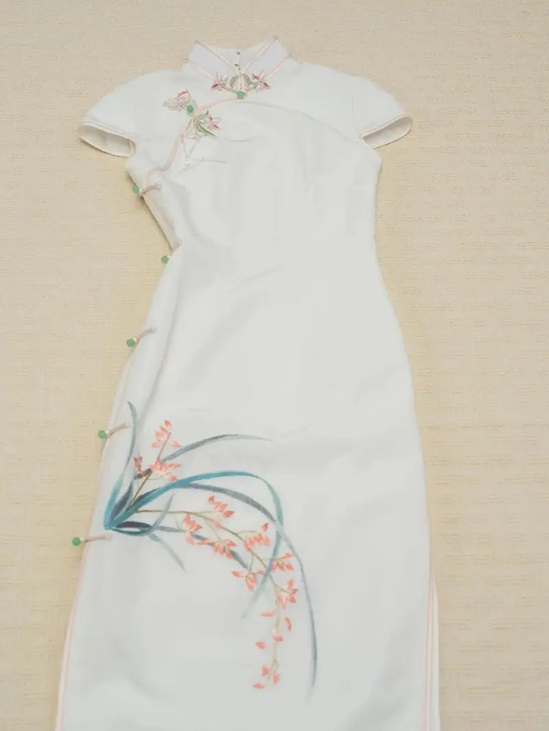 在做工方法上,旗袍也逐渐形成了立体造型制作体系:如衣片上出现了省道,腰部裁剪更为合体并配上了西式的装袖,旗袍的衣长、袖长则大大缩短,腰身也更为讲究,出现了开襟、半开襟、立领盘纽、摆侧开衩、单片衣料、衣身连袖、平面裁剪等制作工艺。