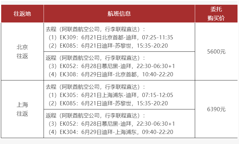 主办方精选了2024年全球最佳航空公司排名中位列第三名的阿联酋航空公司(代码:EK)中转航班,行李可联程直达。参团团友可以选择按照如下两条航班线路,自行购买往返国际机票。也可以委托主办方统一购买,按下表的费用价格随团费一并缴纳即可。