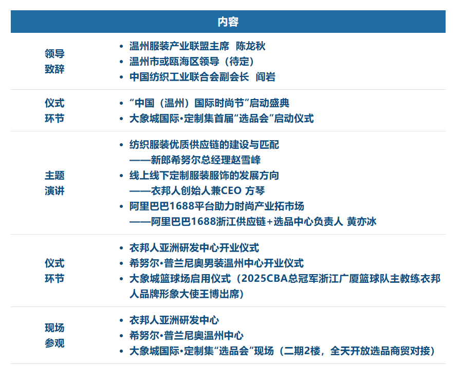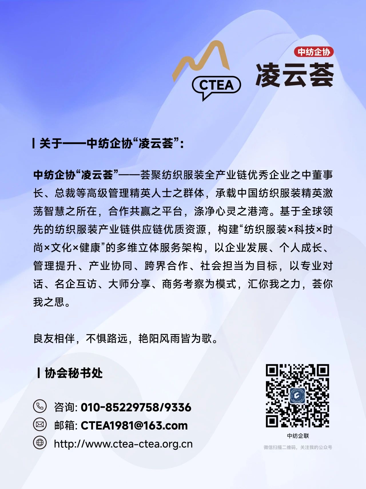 9月26日,温州,中国纺织工业企业管理协会将联合温州时尚流通与供应链研究中心、温州服装产业联盟、温州市服装商会、瓯海服装行业协会、“大象城国际•定制集”等专业机构举办2025中国(温州)国际时尚节&“大象城国际·定制集”首届选品会启动盛典暨“凌云荟·助企行”温州纺织服装供应链商贸对接大会,汇智聚力构建开放、协同、共赢的纺织服装时尚供应链新生态,打造具有世界影响力的时尚新地标。
