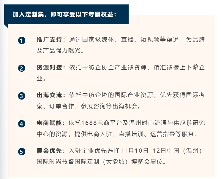 破局者,应时而生!为打通产业堵点,重塑定制新生态,由中纺企协供应链管理专委会、温州时尚流通与供应链研究中心、温州服装产业联盟及温州市服装商会等权威机构联合发起的“大象城国际·定制集”应运而生。