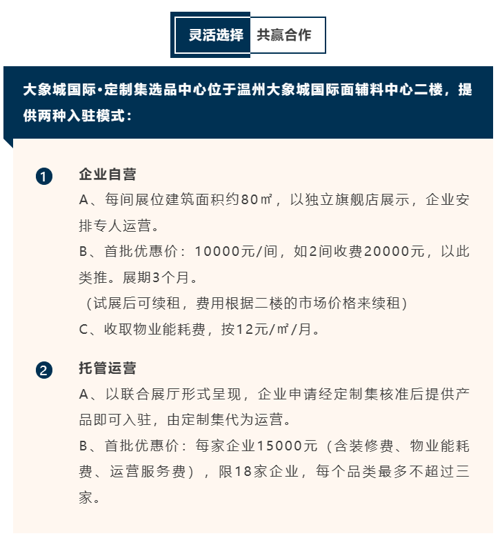 平台根植于温州雄厚的服装产业根基,落位于温州动车南站前大象城国际面辅料中心,坐拥交通便利及成熟专业市场的运营环境以及稳定的客流,具有极强的物理空间与集聚效应,为入集品牌带来持续曝光与高频次业务触达,堪称 “天时地利人和” 之举。我们以“资源集聚”破解“分散”之难,整合资源,为上下游企业提供一个精准对接、一站搞定的平台,共同将困局转化为高质量发展的新动能。