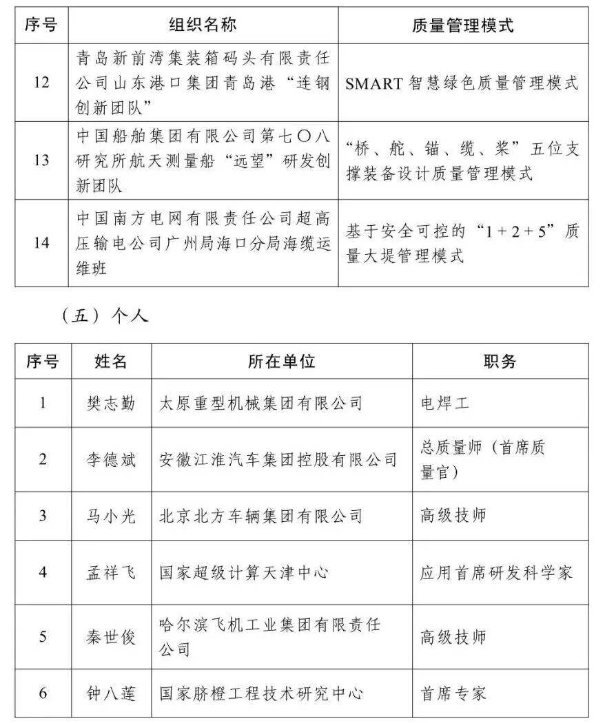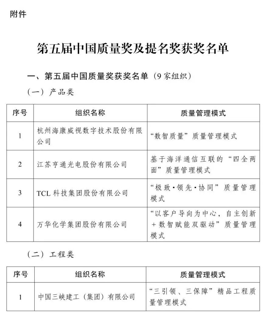 9月16日,在中国质量(南京)大会上,第五届中国质量奖评选结果正式揭晓。9家组织被授予第五届中国质量奖,78家组织和6名个人被授予第五届中国质量奖提名奖。