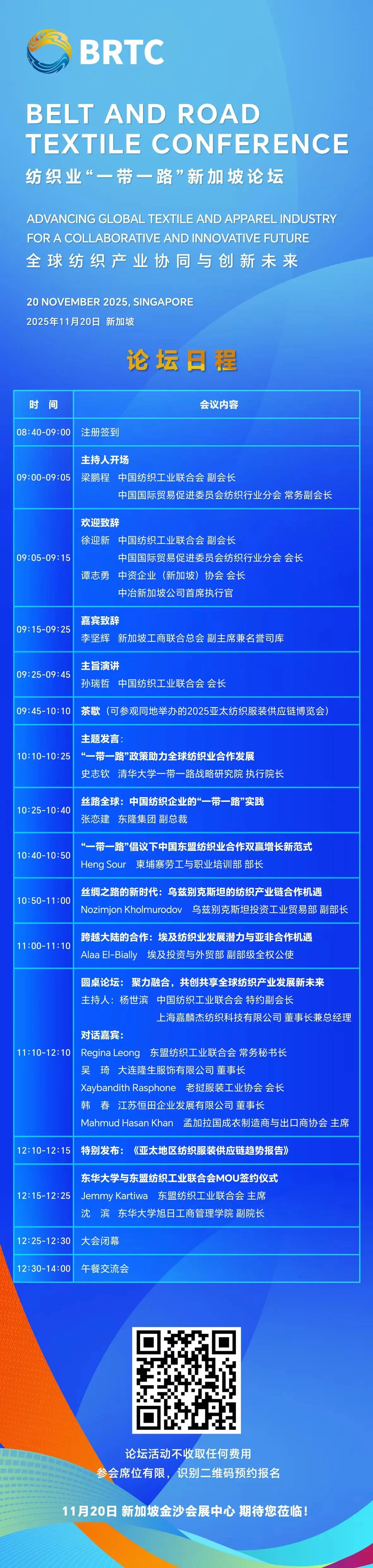 承时代之潮,应合作之势。值此中新建交35周年的重要历史节点,这一盛会首次走出国门,选址新加坡,将于2025年11月20日在新加坡金沙会展中心隆重举办。本届纺织业“一带一路“新加坡论坛以“全球纺织产业协同与创新未来”为主题,聚焦新形势下产业协同路径与创新动能,旨在汇聚各方智慧,共同构建更具韧性与活力的纺织命运共同体,开启共赢共生的崭新篇章。